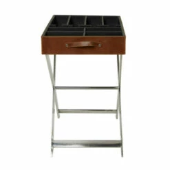 - This wine storage with stand is made of robust stainless steel, wood, fabric, and real leather