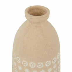 - These tall ceramic bottle vases feature a thick-rimmed neck and a striped body with hand stamped nature patterns