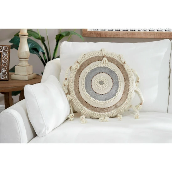 - Textural with neutral tones: This accent pillow is deeply textural with the embroidered layers of looped and cross-stitched round stripes in versatile, warm neutral hues forming a beige, off-white, and gray bullseye pattern; 12 braided tassels with khaki beige ties are sewn around the perimeter of this round pillow like sun rays; beautiful decorative pillows for your bed & couch