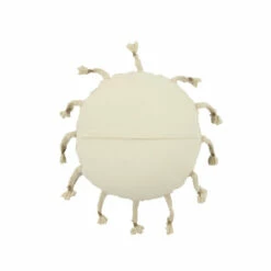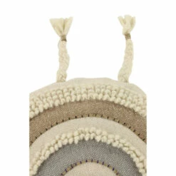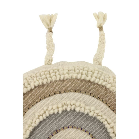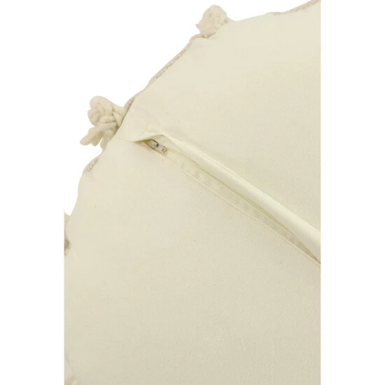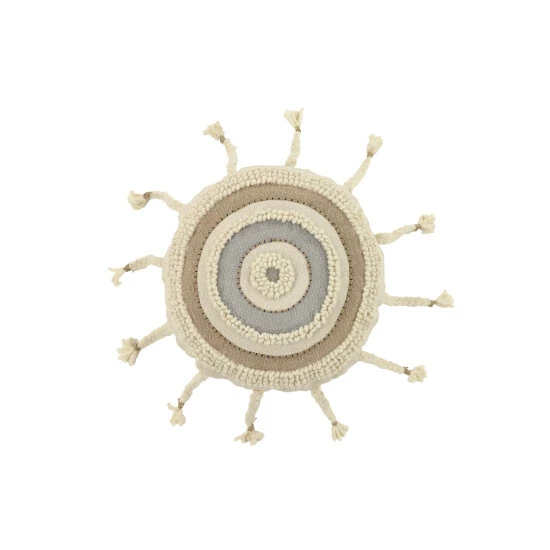 Handmade in India, this beige, crème, and gray throw pillow is deeply textural in both look and feel… Crafted from a 100% cotton in dark wheat beige, eggshell white/crème, and soft dove gray colors, this large pillow emanates rich texture from the round rows of alternating textural loop stitches, cross stitches, and neutral colors. Braids form dangling tassels around the perimeter like sun rays. This decorative pillow has a 100% polyester interior cushion, which keeps its plump shape while providing relaxing, comfortable support.