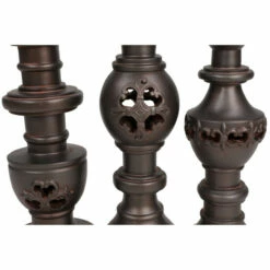 Fill out your shelf or tabletop with this set of 3 tall bronze decorative finials with ornate cartouche, quatrefoil, and fleur de lis carvings. The set is staggered in height with different designs on each for maximum style options but are all uniformly finished in a smooth powder coat of dark bronze with a subtle sheen. This shelf decor set looks especially dramatic against a white or light-colored solid wall or shelf.
