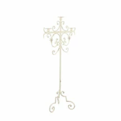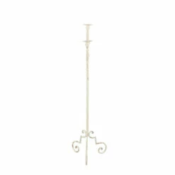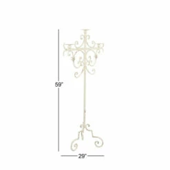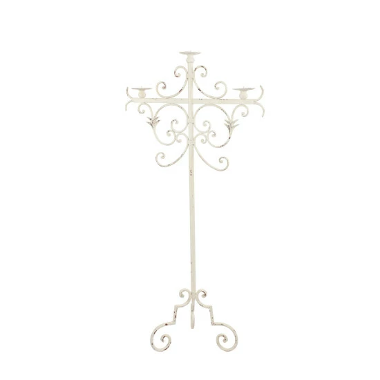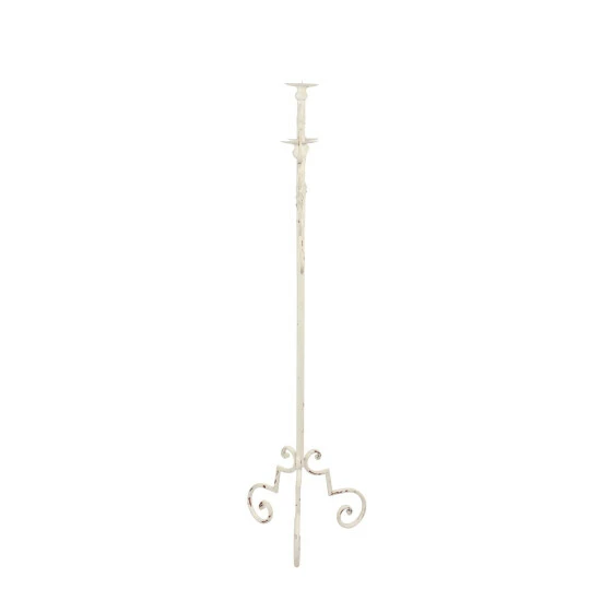 Add antique scrollwork coupled with ambient lighting to your space with this tall, distressed white metal floor candelabra. Prominently displaying 3 pillar candle holders, this tall candle tree has a neutral antique white finish with distressing for a vintage look. The scrolled arms and tripod base also add antiquated looks and dimension while supporting the iron candelabra at the top. This accent décor is a lovely lighting touch in your entryway, living room, or dining room, bringing soft illumination with vintage style.