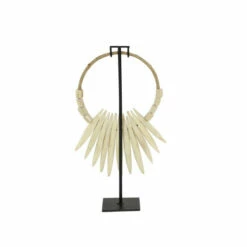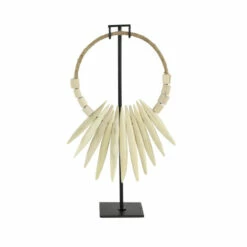 Emphasize your rustic or natural decor dramatically with this handmade, tribal-inspired rustic teak wood sculpture. Each piece of teak wood emanates ivory and light beige/grey-colored hues that look almost like bone, each hand-carved into both pointed spear and rounded bead shapes. Each piece of wood has a carved hole from which it is suspended from a circular metal ring bound in natural-colored twine, adding even more earthy detail and texture to this rustic decor. This item is shipped in one carton. Due to the handmade nature of this item, no two will be alike, there will be slight differences in shape, size, and color. Suitable for indoor use only. Made in Indonesia. Bohemian theme.