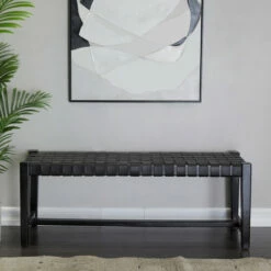 - Authentic leather flaunted in plain weave patterns function as the seat of this long bench