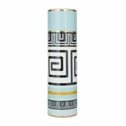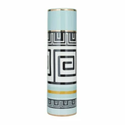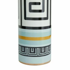- This decorative vase for home decor features a cylindrical structure with eye-catching black and white geometric pattern and a small round mouth opening with shiny gold rim details