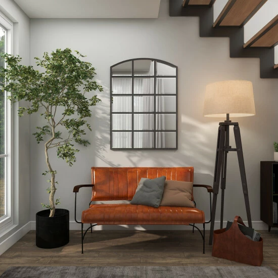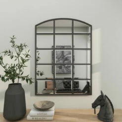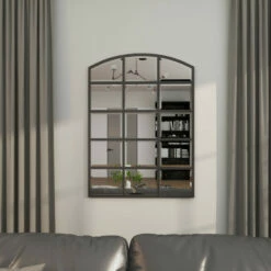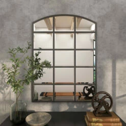 Stack the mirror on a dresser, end table, or mantel for a lovely display. This item ships in one carton. Hardware on the back allows for easy hanging; nails and screws are not included. Suitable for indoor use only. Industrial style.