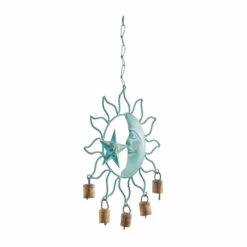 Hang this windchime on your patio or hang it indoors in a bedroom, entryway, or den. A light and delicate piece to create a whimsical atmosphere anywhere in your home. It is a great addition to your home decoration and will surely complement your existing furniture. This item ship in one carton. Designed for safe and easy installation with metal chain and ring. Suitable for indoor use only. Made in India. Eclectic design.. Eclectic design lets your personality shine in your home. This windchime is made of a solid iron materials. This celestial windchime has a turquoise finish for a whimsical touch. Comes with five rusted brass bells and a chain with ring for easy hang any where in your home. This item measures 1″ x 13″ x 11″; and weights 0.77 lbs.