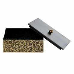 Whether you use this rectangular decorative box as home storage in your living room or as a jewelry box in your bedroom, the undeniable chic style will add a splash of fun pattern and texture to any space. The metal box features hand-painted leopard print in metallic gold and high-gloss black, accentuated by the indentations formed by hammering the metal for added texture. The interior is solid black, topped with the MDF wood lid, also painted black with a reflective metallic gold ball handle. Use to hide away remotes and knick knacks or for larger jewelry pieces.
