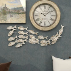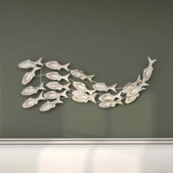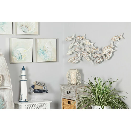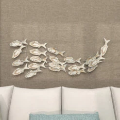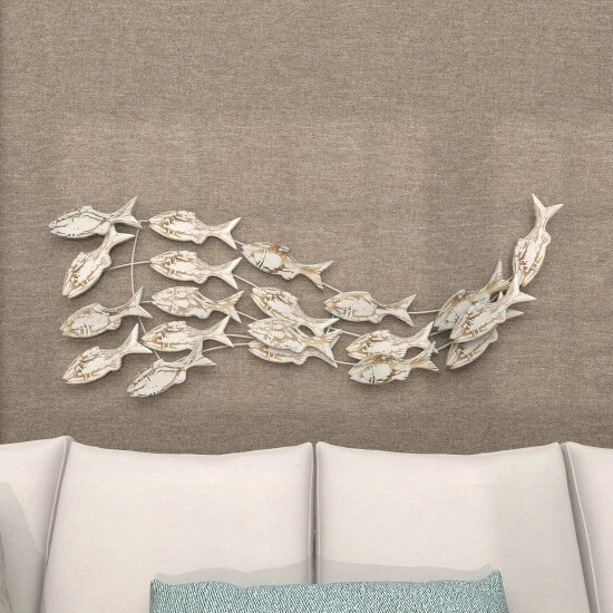 Add whimsical, dynamic movement to your coastal styled home with this wavy, white wooden fish wall decor, made from hand-carved Albasia wood. The textural, naturally white-colored bark of the repurposed wood is handmade into wood fish with deep groves detailing their bodies. Each fish is secured to the wavy white iron frame in a staggered pattern by small iron bars to create dynamic, fluid movement. Sturdy & dimensional, this fish wall decor protrudes 4. 5″ from the wall, allowing a shadow to cast behind it, adding even more dimension to the wave-like movement of the beautifully hand-carved fish. Due to the handmade nature of this item, no two will be alike, there will be slight differences in shape, size, and color. Safe and easy to hang from its metal loops in the strong iron frame. Suitable for indoor use only. This item comes shipped in one carton.