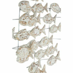 Add whimsical, dynamic movement to your coastal styled home with this white wooden fish wall decor, made from hand-carved Albasia wood. The textural, naturally white-colored bark of the repurposed wood is handmade into wood fish with deep groves detailing their bodies. Each fish is secured to the diamond-shaped, white iron frame. Sturdy & dimensional, this fish wall decor protrudes 4. 5″ from the wall, allowing a shadow to cast behind it, adding even more dimension to the movement of the beautifully hand-carved fish. Due to the handmade nature of this item, no two will be alike, there will be slight differences in shape, size, and color. Safe and easy to hang from its strong iron frame. Suitable for indoor use only. This item comes shipped in one carton.