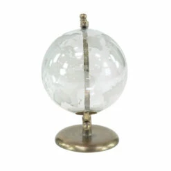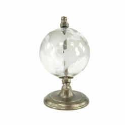 - Metal globe with metallic gold antique finish; transparent glass orb with white world map suspended in center
