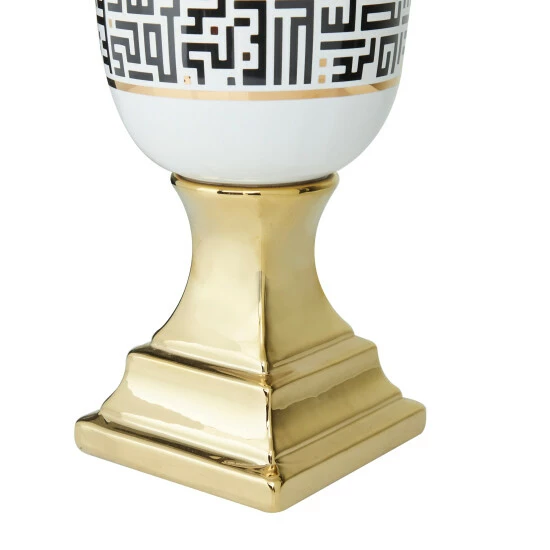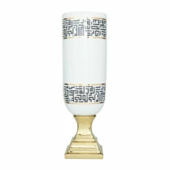 - This goblet inspired decorative vase for home decor features a tall cylindrical structure with eye-catching black abstract pattern with gold band details supported by a gold tiered square stand