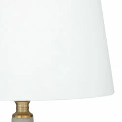 - A modern table lamp featuring a white drum-shaped fabric shade mounted on a gold metal accent and white bottle-shaped ceramic body