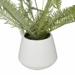 - This artificial fern plant carries glossy green leaves and a smooth white vase