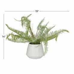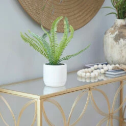 This potted artificial fern plant adds a touch of naturalistic greenery and blooming spring to indoor settings. Use it as an accent piece in the living room or by the hallway console dresser. Make a statement with this unique decor on mantle, console table or in any living space. Add some greenery to your decor with no keep up effort with these artificial foliage. This item comes shipped in one carton. This artificial plant for home decor is made of silk comes in a ceramic vase measuring 4″D x 4. 25″H. Suitable for indoor use only. Contemporary theme.