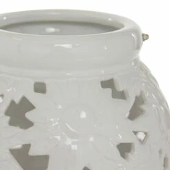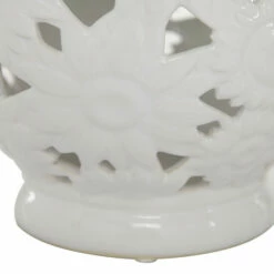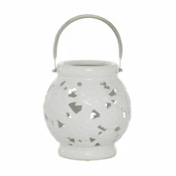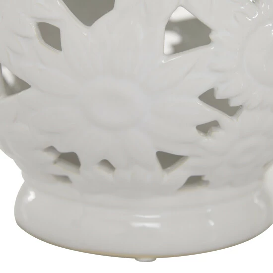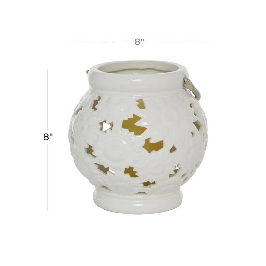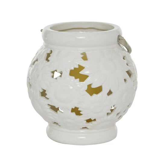 Impress your guests with this lovely table lantern. An embossed floral design ensures this white lantern looks gorgeous even before you light a candle. Once you do insert a candle, the light will escape through the perforated shell and give the space a calming glow. An attached handle makes it easy to move the round light fixture from room to room. This item ships in 1 carton. This candle lantern is meant to sit on top of surfaces but it can also hang via its metal handle. Suitable for indoor use only. Contemporary design. Lantern candle holder can hold 1 pillar candle.