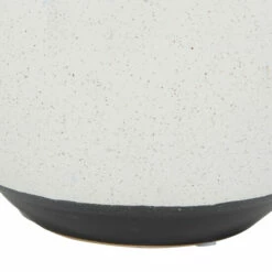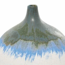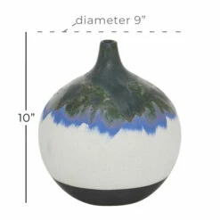 Alone or holding vase filler, this stout round ceramic vase features lovely handmade detail and a rotund bottle shape. The small top with no lip has a bud vase style for displaying a single-stemmed botanical, but also makes for an eye-catching stand-alone accent decor centerpiece. The blue hues swim together and fade from soft black and deep forest green into navy and royal blue with delicate, sweeping brushstrokes contrasting the matte white gritty body. The base is finished in matte black. These versatile yet bold colors make a lovely splash in elevated coastal decor spaces or contemporary decor homes and offices.