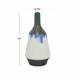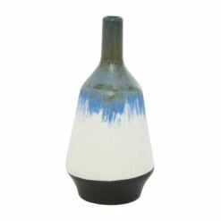 Alone or holding a bold piece of vase filler, this large ceramic vase features lovely handmade detail and a unique kiln shape. The small top with no lip has a bud vase style for displaying a single-stemmed botanical, but also makes for an eye-catching stand-alone accent decor centerpiece. The blue hues swim together and fade from soft black and deep forest green into navy and royal blue with delicate, sweeping brushstrokes contrasting the matte white gritty body. The base tapers in and is smaller than the robust body, and is finished in matte black. These versatile yet bold colors make a lovely splash in elevated coastal decor spaces or contemporary decor homes and offices. Due to the handmade nature of this item, no two will be alike, there will be slight differences in shape, size, and color. This item ships in one carton. Suitable for indoor use only. Long tapered neck bud vase with narrow rim opening. Contemporary design.