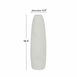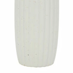 This svelte, elegant vase features a tall, narrow silhouette with a gourd texture throughout the cylindrical body. The small opening at the top has no lip, a very modern touch, and allows for a small bundle of vase filler to be prominently displayed. The eggshell white finish is soft and matte and has some light speckling for a pop of subtle texture. This decorative vase will work with any color palette or pattern and especially pops in contemporary style spaces.