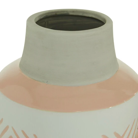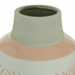 Evoking a warm and cozy feel, this set of small stoneware vases is an ideal decorative accent in living spaces of farmhouse or country cottage styled homes. The ceramic pair features a matte finish with pink geometric textured patterns around the body. Each vase features a narrow neck with the shoulders widening to the body in a pink finish. Place large leafy plants or small bouquets to elevate the old-world charm of farmhouse or country cottage style interiors. Suitable for indoor use only. The opening of this vase se is 3″. Set of 2 ceramic vases in a matte finish. This item comes shipped in one carton.
