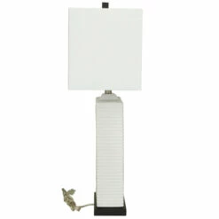 Add a hint of elegance and brighten your living room or bedroom corners with this ceramic table lamp for a seamless upgrade to your interior design. Furnished with a socket for lamp bulb. Bulb not included. This item ships in 1 carton. Lamp cord measures 74″ in length. Suitable for indoor use only. Features a cotton square shade that measures 17″L x 10″W x 11″H. Comes with an on/off toggle switch. Modern style.
