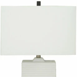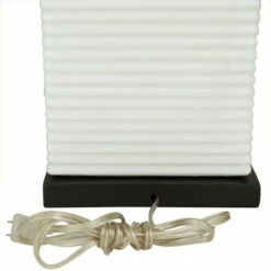 - White ceramic side table lamp features a slightly elevated black base complements the white cotton square shade and horizontal ribbing on the body for an added texture