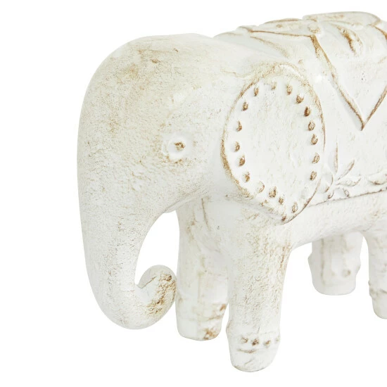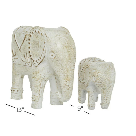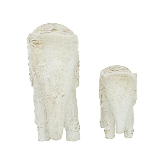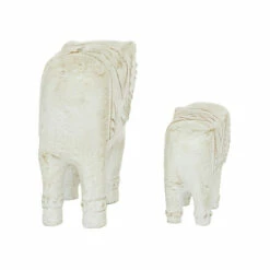 The construction of this 2-in-1 elephant sculpture set was given a dirty white/brown finish to turn it into a versatile display that can fit in a bohemian interior concept. However, its color is best appreciated against printed drapes and woven table linings. Display the pieces together or separately on top of mid-height dressers or tables next to potted plants to complement the life-like theme. Display with printed drapes and table linings to best appreciate design. Wipe clean with a dry cloth. Suitable for indoor use only. Made in India. This is a two-piece set of elephant sculptures. Bohemian theme. This item comes shipped in one carton.