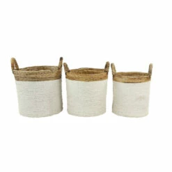 Handmade from natural seagrass, these white baskets are airy and bright. The natural banana bark upper and handles add a touch of rustic texture to these large baskets, whose versatile style make them perfect tote bags, laundry baskets, or simply as coastal style display baskets. Sure to add cheery, natural style anywhere you put them, these tall, seagrass baskets’ deep storage space ensures you get both fashion and function. This item comes shipped in one carton. Deep bucket shapes offer ample storage. Suitable for indoor use only. Made in Indonesia. Set of 3 round woven storage baskets. Coastal design.