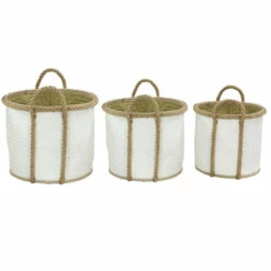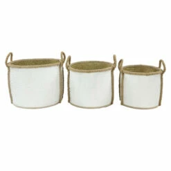 Add this set of 3 decorative palm leaf wicker storage baskets to your rustic, contemporary, or coastal decor, handmade from sun-dried palm leaves, dip-dyed into matte white paint, then woven into round baskets. Each wicker basket features a diagonal basket weave design throughout, with natural rope running along each side to form large, 3″ half-looped handles secured in place with matching natural-colored twine for easy carrying (and added charm!). This item comes shipped in one carton. Suitable for indoor use only. Made in Vietnam. Set of 3 round woven storage baskets. Coastal design.