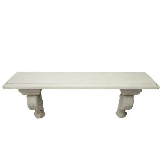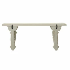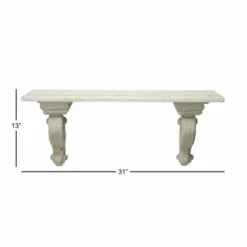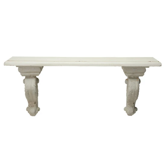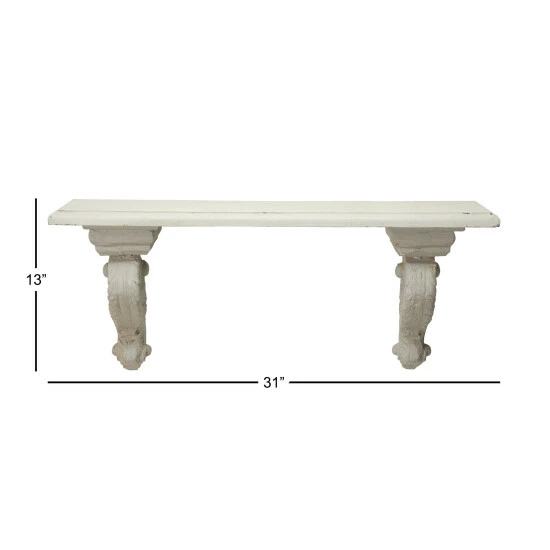 Display your coveted wares with soft vintage style on this ivory floating wall shelf, boasting decorative scrollwork along its soft beige edges. The long, flat rectangular shelf surface securely displays your photos and Knick knacks while the rolling base adds antique flair and dimension to your wall. The neutral soft white and beige tones work with any color palette, and the decorative chipped finish adds extra character. This item comes shipped in one carton. There are keyholes on the back for easy hanging. Suitable for indoor use only. Holds up to 20 lbs. Farmhouse-themed style.