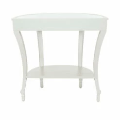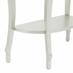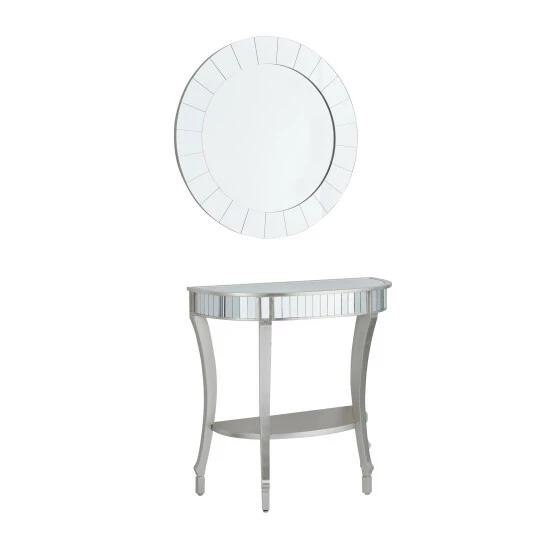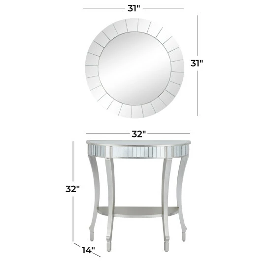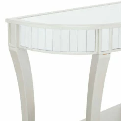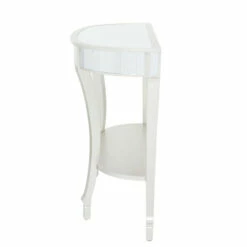Get organizing with this half circle console table and add a dash of sparkle to any of your home spaces. Useful and elegant, console tables are more than just a place to throw your mail. Bring a finishing touch to your home with an inviting appeal with this console table and mirror set. Designed with rubber stoppers to prevent scuffing and sliding. This item comes shipped in one carton. Wooden table is detailed with mirror overlay and furnished with a flat bottom shelf. Suitable for indoor use only. Glam inspired. Maximum weight limit is 100 lbs.. Glamorous and elegant, this decor adds some glam to your home. This home decor is crafted with wood and overlaid with mirrors for a solid and durable form. This glam console table is overlaid with mirrors and highlights a semi glossed white finish. Precisely cut glass mirrors outline the top and skirt of this console table that complements its splayed tapered legs. Each item measures 32″L x 14″W x 32″H, 31″L x 1″W x 31″H and weighs 29 lbs