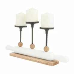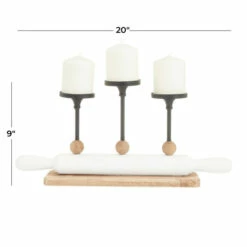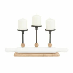 - 3 candle metal candelabra showcases a baking rolling pin laying on top of a wooden tray design and features 3 singular candelabra posts
