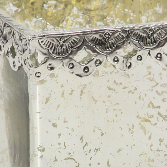 - Each candle holder features a metallic silver finish with light gold speckles