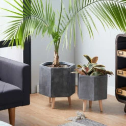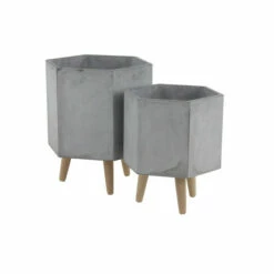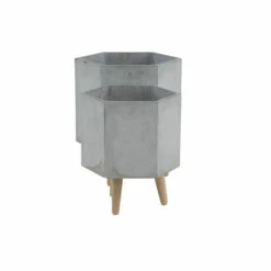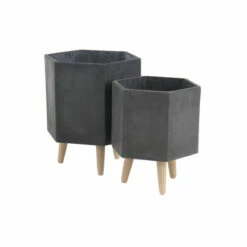 This set of hexagon planters brings tranquility to your space by allowing you to fill them with plants—hence it promotes wellness and creates an immediate feeling of relaxation. These decorative planters are sure to add bundles of charm to your home. Beautifully detailed, they feature hexagon-shaped pots in matte gray finish and beige short legs for extra support. These planters are made out of ceramic, wood, and fiber clay with solid construction, offering durability and stability. Jazz up contemporary themed spaces using this set of charming accent pieces that are ideal for both indoor and outdoor use. Contemporary accent decor great for both indoor and outdoor use to display your favorite flowers and plants Wipe clean with a dry cloth. These planters are designed with beige short legs for extra support. Suitable for indoor and outdoor use. Made in China. Pots do not have drainage holes. This item come in a set of two. Contemporary design. This item comes shipped in one carton.