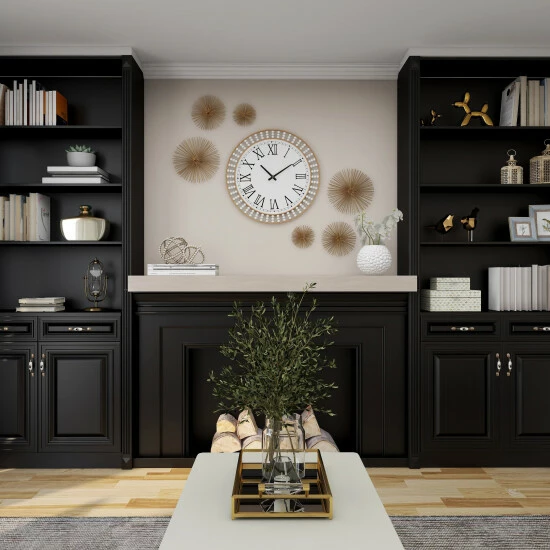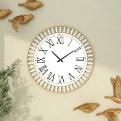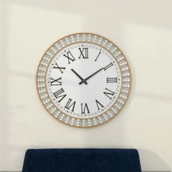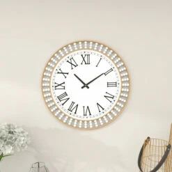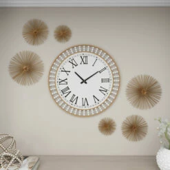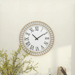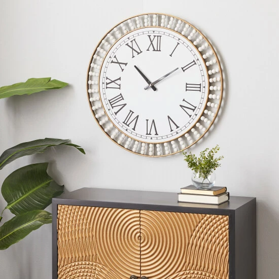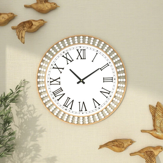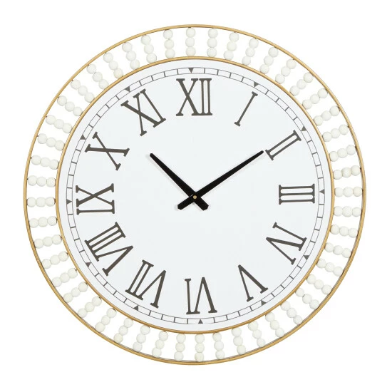 For a balance of glamor and rustic influence, a shabby chic inspired living space must have this chic white and gold round metal wall clock as a focal point wall decoration. This wooden wall clock features an elegant round design outlined by 2 gold finish rings. In between the two gold rings are white wood beads skewered to form a mesmerizing pearl white pattern between the gold rings. The white clock face features black finish roman numeral hour markers and bar lines for minute markers. This wall clock will make heads turn towards any wall in your chic inspired home with the balanced glamorous, and rustic vibes it carries with it.