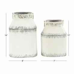 Take a trip down memory lane with these white decorative metal milk cans. Accented with white finish, these metal cans are sure to warm up your farmhouse-themed home. Each of these decorative canisters feature conveniently placed single metal handles. Its neutral white distressed finish easily compliments a vintage palate and is a wonderful piece to any rustic or farmhouse-inspired home. Displayed solo or with other similar themed decor for some nostalgic reminiscing, this set of two metal milk cans go well as cozy tabletop centerpieces or vases. Designed with black rubber stoppers at the base that prevent scratching furniture and table tops, as well as sliding around. This item comes shipped in one carton. Suitable for indoor use only. Comes in set of 2 which is convenient as holding Decors, vases or exhibits. Farmhouse-themed style.