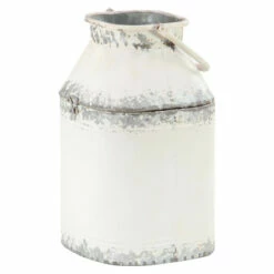 - This farmhouse style inspired design white iron milk can features a unique distressed white paint design along the neck, the base, and the edge connecting the body and the neck