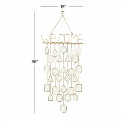 Make guests feel at home on your porch or in your garden. This dazzling metal wind chime says, “Welcome” as it sways in the breeze. Reflective shapes dance below the message, held together by gold-colored chains. The wind chime also makes a great indoor decoration, when you want to add light and shimmer to a bedroom or entry way. This item comes shipped in one carton. Item features metal loop for easy and secure hang. Suitable for indoor use. Made in India. Eclectic theme.
