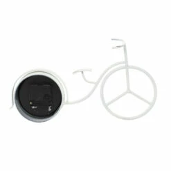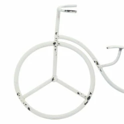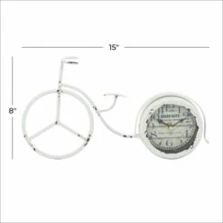 Pedal your way through time with this rustic distressed white metal decorative bicycle clock. This decorative clock is ingeniously crafted into a bicycle-infused art piece that features a complete distressed white finish for that vintage vibe. Parked on your shelf or side table as a standalone decor or paperweight, this bicycle clock is a timeless piece for your coastal, shabby chic, boho, or any traditional-themed home space. Requires 1 AA battery, not included. This item comes shipped in 1 carton. Arabic numbers and hash marks on a white clock face. The clock mechanism runs silent. Suitable for indoor use only. Farmhouse-themed style. Metal clock makes a great gift for any occasion.