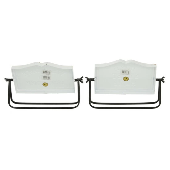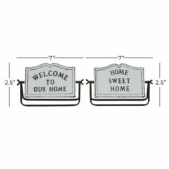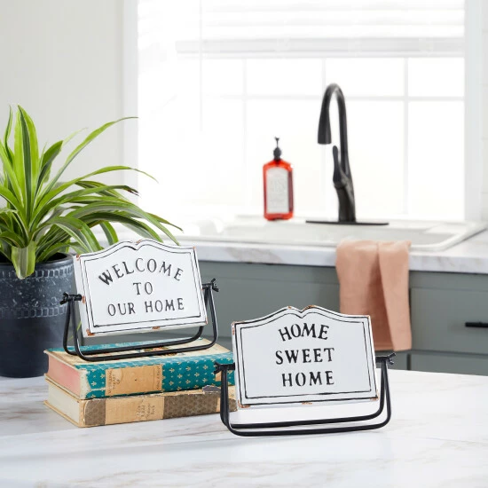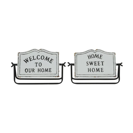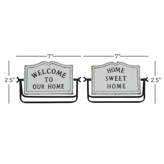 This lightweight table decor makes a friendly greeting for a welcoming atmosphere. This home decor is perfect for creating a focal point over your any counter or table space for a heartwarming appeal. Designed with a farmhouse style for that homey feeling. This item ships in 1 carton. Metal decorative sign makes a great gift for any occasion. Suitable for indoor use only. This set includes 2 decorative sign. Farmhouse-themed style. Message reads “Welcome to Our Home” and “Home Sweet Home”.