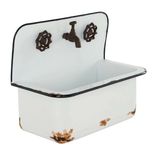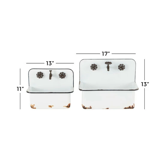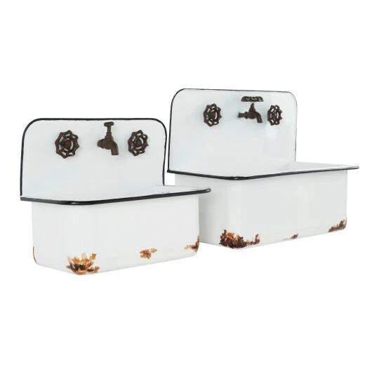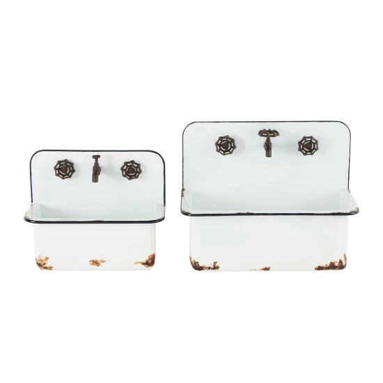 Rich in antiquated farmhouse style, this set of 2 white sink planters makes adorable and unique metal wall plant displays in your garden or indoor space. Each antique looking sink, one large and one small, has decorative rust and faucet accents for an authentic feel, and large enough bodies to hold several plants, large plants, and let long leaves cascade along the white metal for a romantic look. Flat backs let you display flush to any wall and are ready to hang by keyhole hardware. Hang these planters outside of your home or near your garden for a stylish look Wipe clean with a dry cloth. Ready to hang by keyhole hardware. Suitable for indoor and outdoor use. The set includes two planters. Farmhouse-themed style. This item comes shipped in one carton.