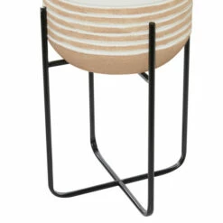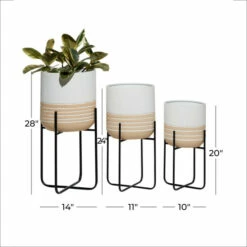 Leverage on the variation in pot depth and stand height, color, and ceramic-like finish of this 3-in-1 set of indoor planters for contemporary or art deco interior designing. Such features can complement almost any color palette, pattern, and texture. The solid construction of both X-based stands and no-drainage hole pots are made of iron to add pizzazz to a corner of your living space. Planter heights are 20″, 24″, and 28″. Use as plant holders or corner accent pieces in art deco or contemporary interiors. Suitable for indoor and outdoor use Pots have no drainage holes. This set comes with 3 planters. Farmhouse vibe. This item comes shipped in one carton.