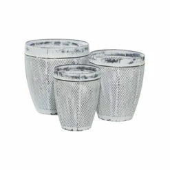 Verdant plants and flowering shrubs provide serene respite in these hectic times. And they need the proper holder to maintain a home’s theme. This set of three planters, crafted from iron in a whitewashed textured grey finish, elevates the look of farmhouse and rustic-style homes and gardens. Place leafy plants and flowering shrubs to highlight the old-world charm of gardens, patios, and indoor/outdoor spaces. Great additions to gardens, patios, and outdoor spaces with a rustic and farmhouse theme Wipe clean with a dry cloth. Suitable for indoor and outdoor use Pots do not have drainage holes. This set includes 3 metal planters. Farmhouse-themed style. This item comes shipped in one carton.