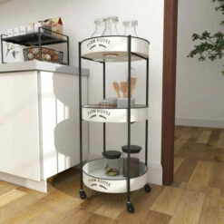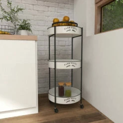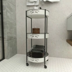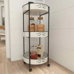 Use this farmhouse organizer cart in your living room or kitchen for additional storage. This item ships in 1 carton. Cart rolls on four wheels.. Suitable for indoor use only. Some assembly required. Each shelf can hold up to 10 lbs.. Farmhouse-styled style. Showcases embossed “FARM HOUSE” typography on front of each tray.