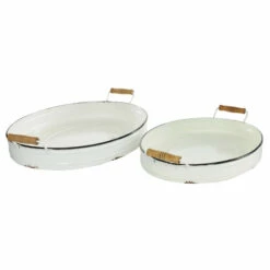 - Oval metal tray set of 2 measures 21″ in length, 15″ in width, 4″ in height, 18″ in length, 12″ in width, 4″ in height, and weighs 1.15 lbs