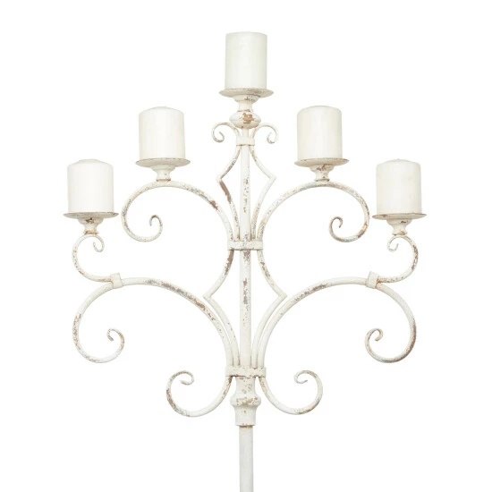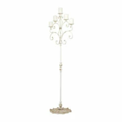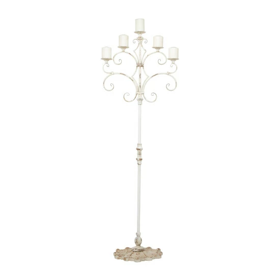 Illuminate your living room or bedroom with this white floor candleholder and add a classic and elegant touch to your home corners. Delight your guests and make any occasion extra special by adding lighted or flameless candles to this candelabra. Made with a sturdy base, it is perfect for creating an elegant atmosphere at your table top or mantel. This candelabra style floor candle holder can hold 5 pillar candle. This item comes shipped in one carton. Sculpted and molded metal constructed to form candelabra floor candle holder. Suitable for indoor use only. French Country design.
