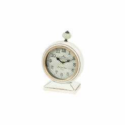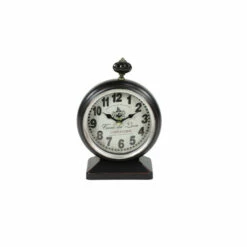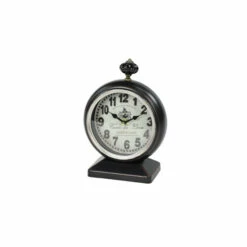 Add glamour in your home by simply displaying them on side tables as supplementary décor and adding another on your night stand or home office desk for an effortless time check every time. Stylish and functional, this set of 2 round metal table clocks make for great accent table decor pieces for your vintage-styled space with their gourd-shaped finials, pyramid bases, bold serif numbers, and elegant French script. Requires 1 AA batteries. Not Included. This item comes shipped in 1 carton. Features Arabic numerals for the hour and minute markers. The clock mechanism runs silent. Suitable for indoor use only. This set includes 2 clock. Clock face with text “Grand Vin De Bordeaux”, “Cerre Du Lion”, “Saint- Julien” and “Clement Audierne”, “Rue Victor. Hugo Paris”. Vintage inspired.