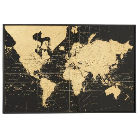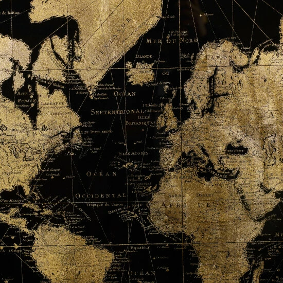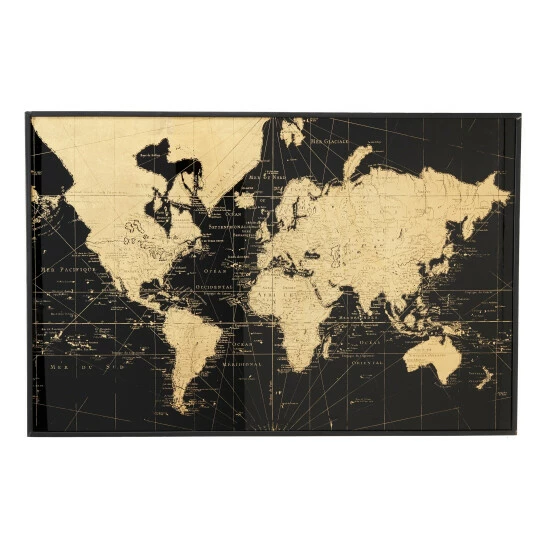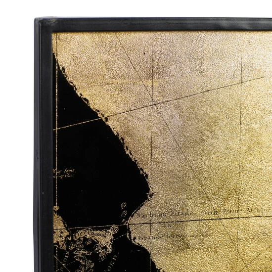 - Large wall decor with reflective black glass and metallic gold illustration of a vintage world map