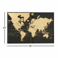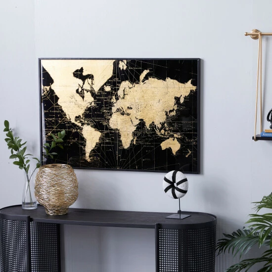 Bring luminescent vintage style to your wall with this large, rectangular black and gold glass world map wall decor. Reflective black glass is painted with metallic gold to create a vintage style world map and meridian lines. A fine sparkle in the metallic gold paint brings even more shine when light hits. A black iron frame houses this glass wall art piece. There are keyholes on the back for easy hanging. Suitable for indoor use only. Vintage wall art features hundreds of country names listed in metallic gold text. This item comes shipped in one carton.