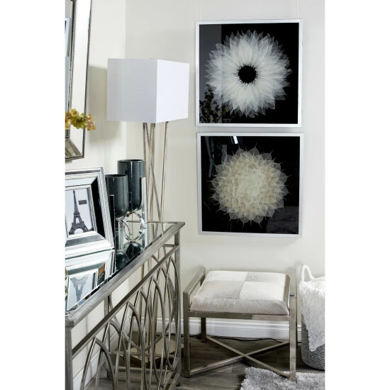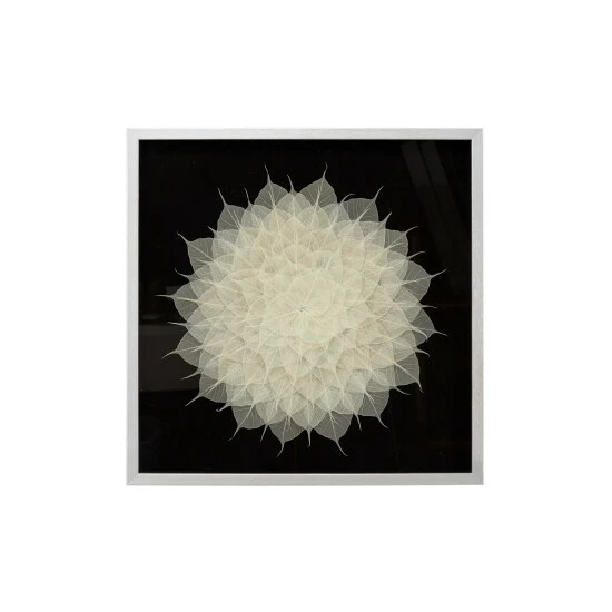 Statement wall art with botanical and natural style… Layers of translucent eggshell white leaves are meticulously placed in a radial pattern forming a textural and gradient mandala design. A square, textured silver frame houses this dimensional natural wall decor whose leaves really pop against the solid black background in the shadow box. The neutral silver, black, and off-white hues of this wall accent piece will work with any color palette in your space.